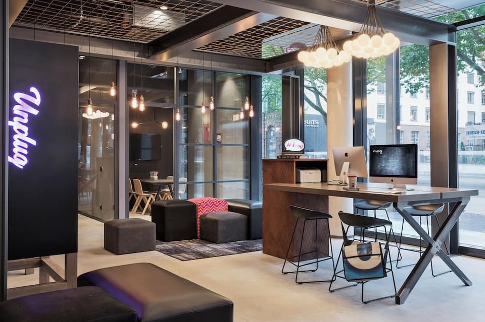 MOXY Frankfurt East se encuentra cerca de una estación de metro, en el área de Ostend en Frankfurt. Las personas que deseen ir de compras pueden visitar Centro comercial MyZeil y Skyline Plaza, mientras que quienes quieran conocer los puntos de interés más famosos del área pueden ir a Zoológico de Fráncfort y Jardín de las palmeras. ¿Quieres asistir a un evento o partido mientras estás aquí? Échale un vistazo al calendario de actividades de Estadio Deutsche Bank Park. Hotel con restaurante cerca de Banco Central Europeo Este hotel para no fumadores cuenta con un restaurante, una sala de fitness abierta las 24 horas y un bar o lounge. El acceso a wifi en las áreas comunes es gratuito. También dispone de un centro de negocios disponible las 24 horas, una cafetería y estacionamiento. MOXY Frankfurt East tiene 220 opciones de hospedaje con secadora de cabello y cortinas blackout. Hay televisión de pantalla plana de 49 pulgadas con canales por cable. Los baños están equipados con regadera con regadera tipo lluvia. Este hotel en Frankfurt ofrece acceso a wifi gratis con una velocidad de 500+ Mbps (ideal para 6+ personas o 10+ dispositivos). Se proporciona servicio de limpieza todos los días. Las alternativas de recreación en este hotel incluyen sala de fitness abierta las 24 horas.