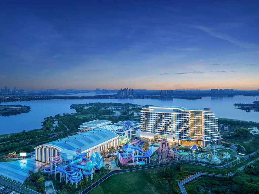 Senbo Nature Park & Resort Chengjian Wuhan is located on the north bank of the Houguan Lake, in the Wuhan Sino-French Eco-City, boasting a 3.4 km lakeshore and picturesque surroundings, with unique natural scenery. It is near the "Sino-French City" exit of Wuhan's Fourth Ring Road, 1.5 km from Metro Line 4 "Xintian Station" and the planned Wuhan West Railway Station, with a 30-minute drive to the city's railway stations and Tianhe Airport. The transportation is effortless. The project spans 22.85 hectares (about 343 mu), with a total floor area of 128,000 square meters and an investment of 2.2 billion Chinese yuan. Positioned as a high-end family eco-resort complex on the city near outskirts, it integrates theme parks, hotels, business events, dining, and education to offer a one-stop, all-season destination. It has 585 guest rooms (287 twin beds rooms), split into centralized guest rooms and wooden cabins. The resort includes 28,000 square meters of indoor and outdoor water parks,6,000 square meters of indoor and outdoor children's parks, 5,400 square meters of outdoor amusement area, and 6,000 square meters multi-functional hall (with a 1,200 square meters main hall, 8meters high), plus a 5,000 square meters restaurant with 2,000 seats. The surrounding lakeside greenway covers about 360 mu.